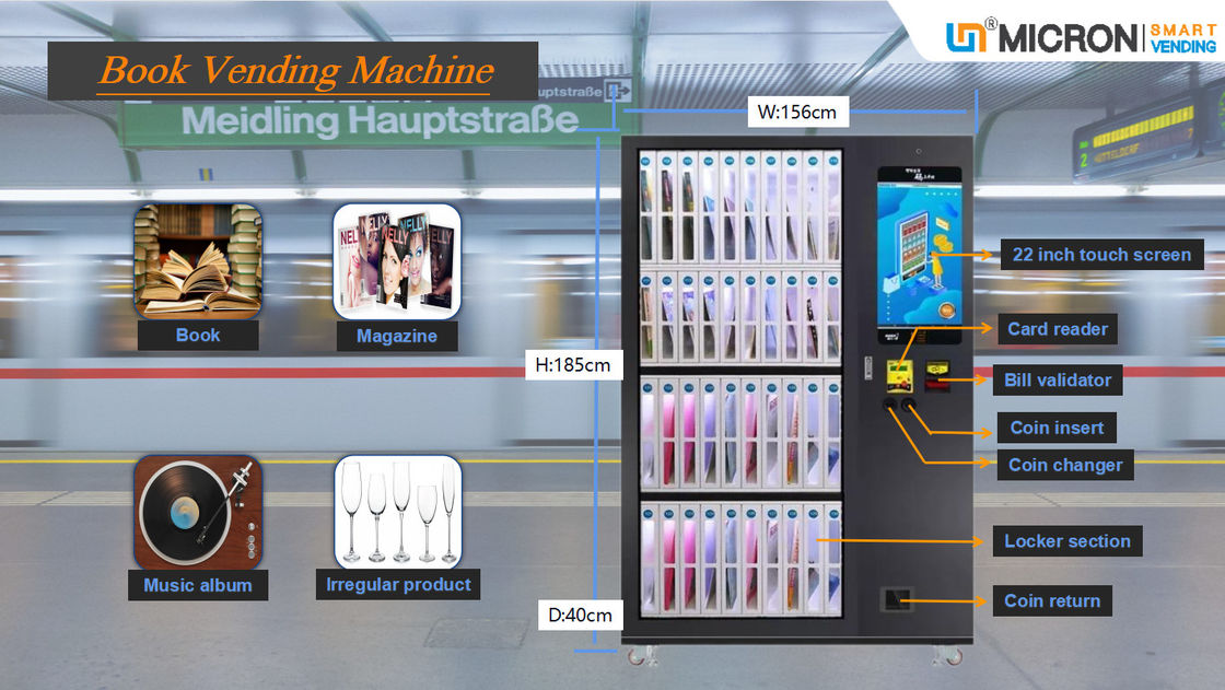 دستگاه فروش کتاب، دستگاه فروش خودکار با اندازه سفارشی، دستگاههای ما از طریق شبکه WIFI یا 4G به اینترنت متصل هستند. ما نرمافزاری برای استفاده از صفحه نمایش و اینترنت توسعه میدهیم. به همین دلیل فروشندگان میتوانند موجودی را از راه دور نظارت کنند، تبلیغات را از رایانه شخصی یا تلفن همراه آپلود کنند، حتی نور LED/دمای دستگاهها را در هر مکان و هر زمان کنترل کنند.